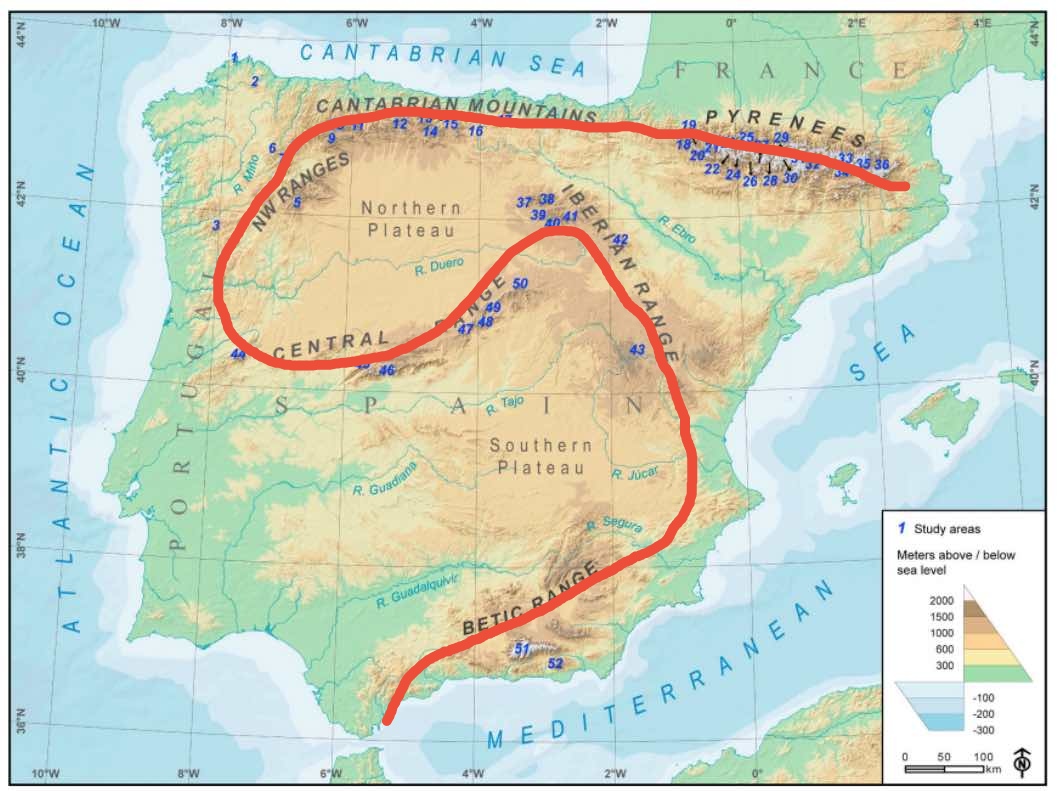 If you like to fly over mountains, you should know that Spain is the second most mountainous country in Europe after Switzerland. You can fly from Gibraltar to Barcelona by the route that I indicate on the map without stopping flying over mountains