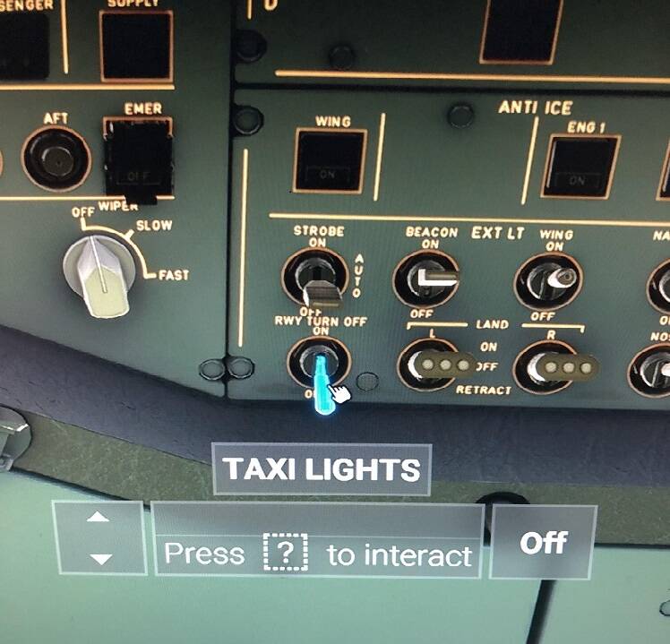 I done the update yesterday, Saturday, but now the cockpit knobs switches etc, donât work. When I put the mouse say on the Taxi Lights switch or any knob, it just glows blue and a widow pops out with the name of the knob or switch and under it says âPress ? to Interactâ but nothing happens. Please see pic below as an example.