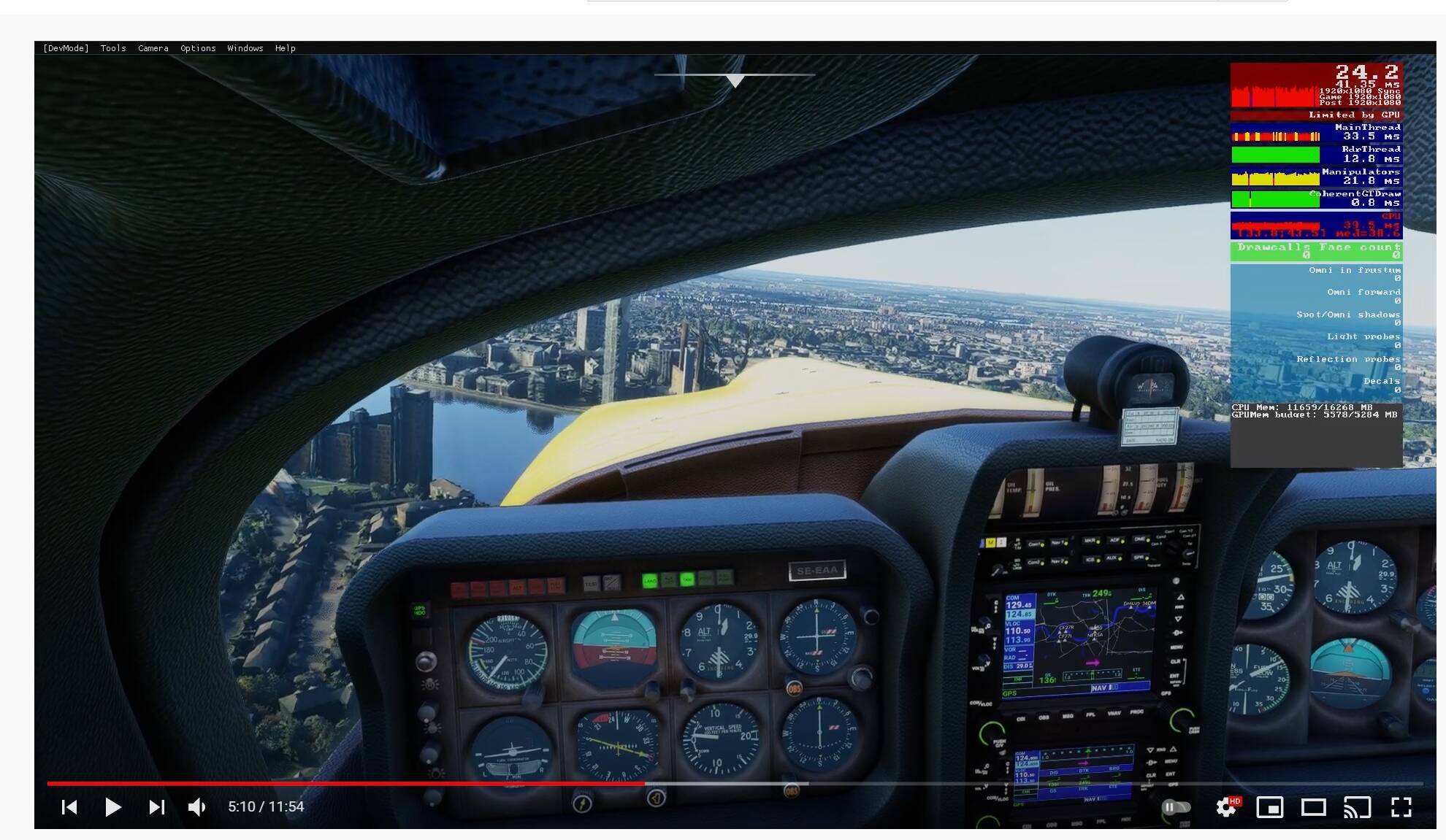 (see screenshots), which I am of course playing with Youtube settings 1080 / 60, as you can see, that the fps counter jumps from as low as 17.6 FPS up to 24.2 FPS. I don’t know how a G-sync Monitor behaves, if you have one, but I know for sure, after years of experience, dozens of games and quite a few sims too, that on a “normal” 60 Hertz monitor such a fluctuation can never display a fluid movement. Ideally, one locks the V-sync and frames to solid, fixed, 60 FPS, which results in a perfect sync to the monitor, or, if the game / sim / application graphics engine does not allow this, then to the exact half of that, 30 FPS. That’s what I do on MSFS, with decent results. Though ideally, 60 FPS would be much better.