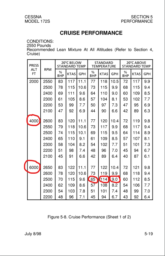 I have selected the numbers corresponding to 6000’ at 65% Cruise power with 2500RPM which will consume 9 gallons of fuel per hour and will fly me at 114 KTAS. Go ahead and type that. You can select a higher or lower power, depending on your preferences and needs.