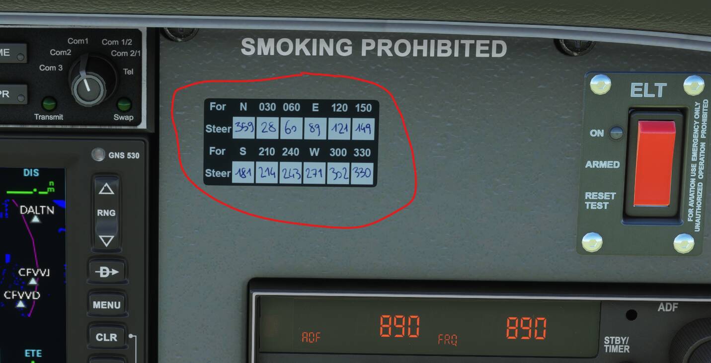 To finish these heading calculations we have to take into account the own deviation of the compass, which, I think is modeled into MSFS. Here is a picture of the numbers (which are placed on he form for easy retrieval)