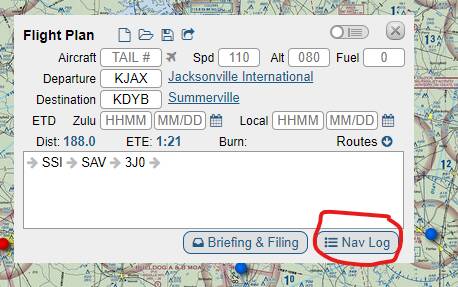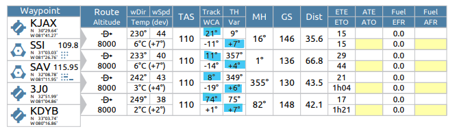 The first step is to set the Departure airport (KJAX), the Arrival Airport (KDYB) and the cruising altitude. In the USA, airplanes flying VFR above 3000’ should follow a specific altitude, depending on the direction of flight, In this case we will flying Easterly, so we will be at an odd altitude (3500, 5500, 7500) for those flights going westerly, the opposite applies. My selected altitude based on the wind aloft and cloud cover forecasting will be 5500’. So go ahead and type that.