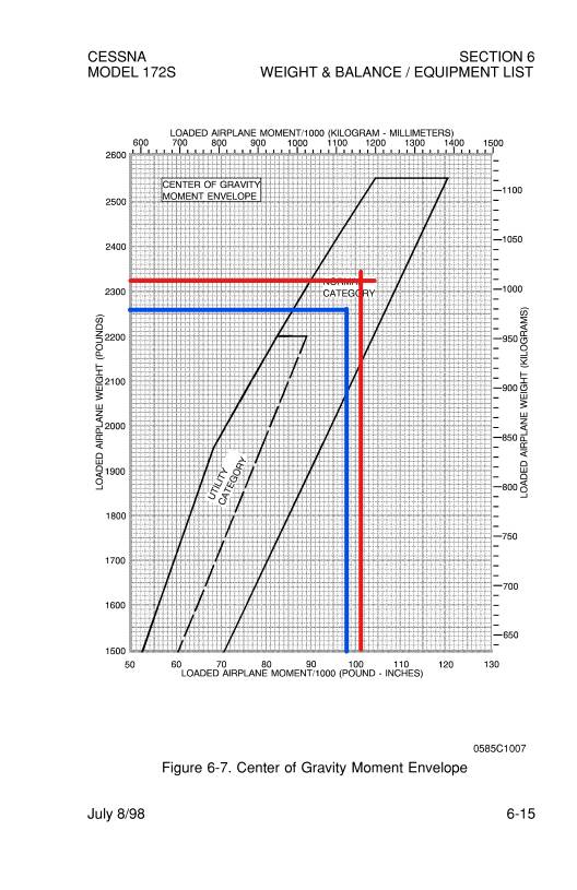 As you can see on the graph, if I plot the weight and moment of the airplane loads, I am well within the normal category on take off (red) and Landing (blue).
