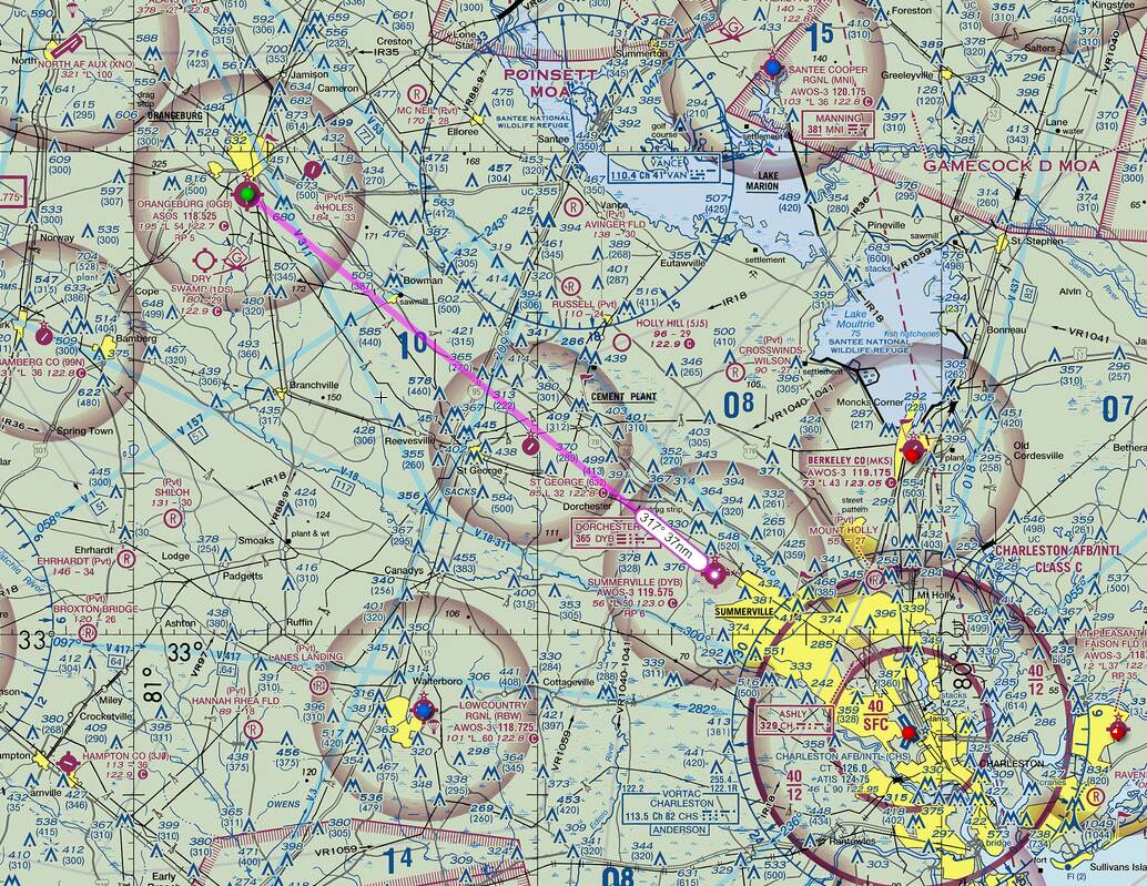 There are several airports in the vicinity of KDYB that can be used as alternates. I will pick KOGB because I know that If I pick that one, I would be also able to fly to many other places that are close. Distance is 37 nm, put that on the box