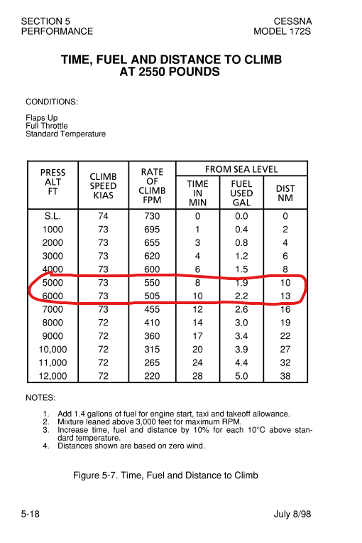 To climb to 5500’ we will use approx. 9 min, 2 gallons of fuel and it will take us about 12 miles to get there. Put those numbers on the box.