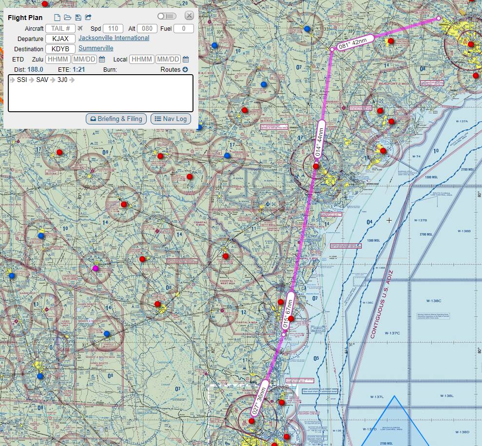 Departing from KJAX, my first waypoint is SSI, a VOR and the distance is 36 nm. The VOR frequency is 109.8 and the radial to track is 27deg. all there to see on the map. Put that data on the plan.
