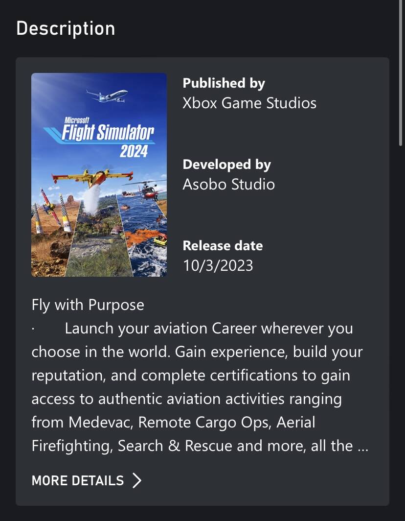 Speaking of, this reminds me. The Xbox Cloud Gaming page still has a 2023 release date for MSFS 2024 on it. Who knows, maybe they tried to push for a 2023 release until someone decided it was not good enough and delayed it to 2024. Whatever it is, somebody clearly forgot to change the release date to actual.