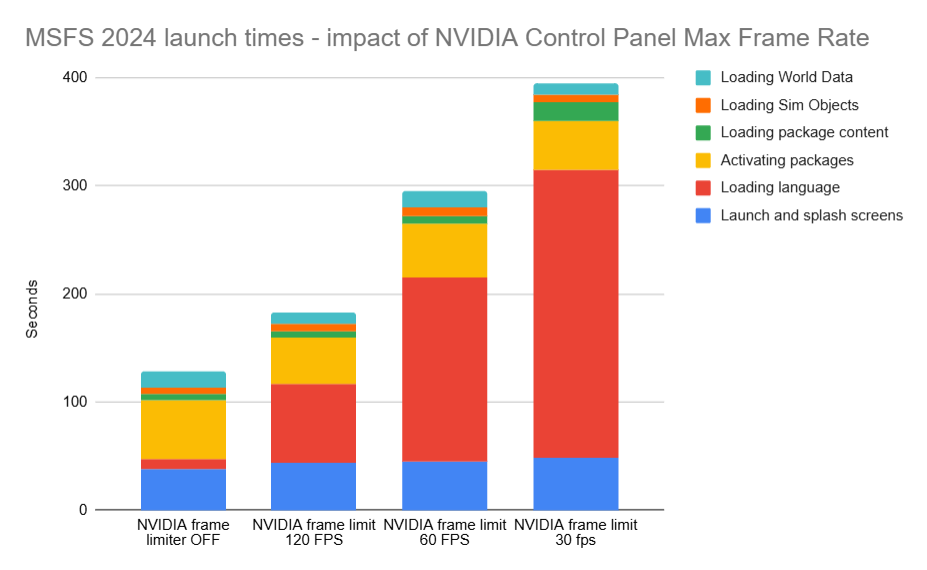 Observed result: The NVIDIA Frame Rate cap has a direct and significant impact on the time taken to launch MSFS 2024, as shown below. The vast majority of the time lost is in the āLoading languageā phase of launching MSFS 2024. Note I have performed these tests multiple times to ensure the data is reliable.