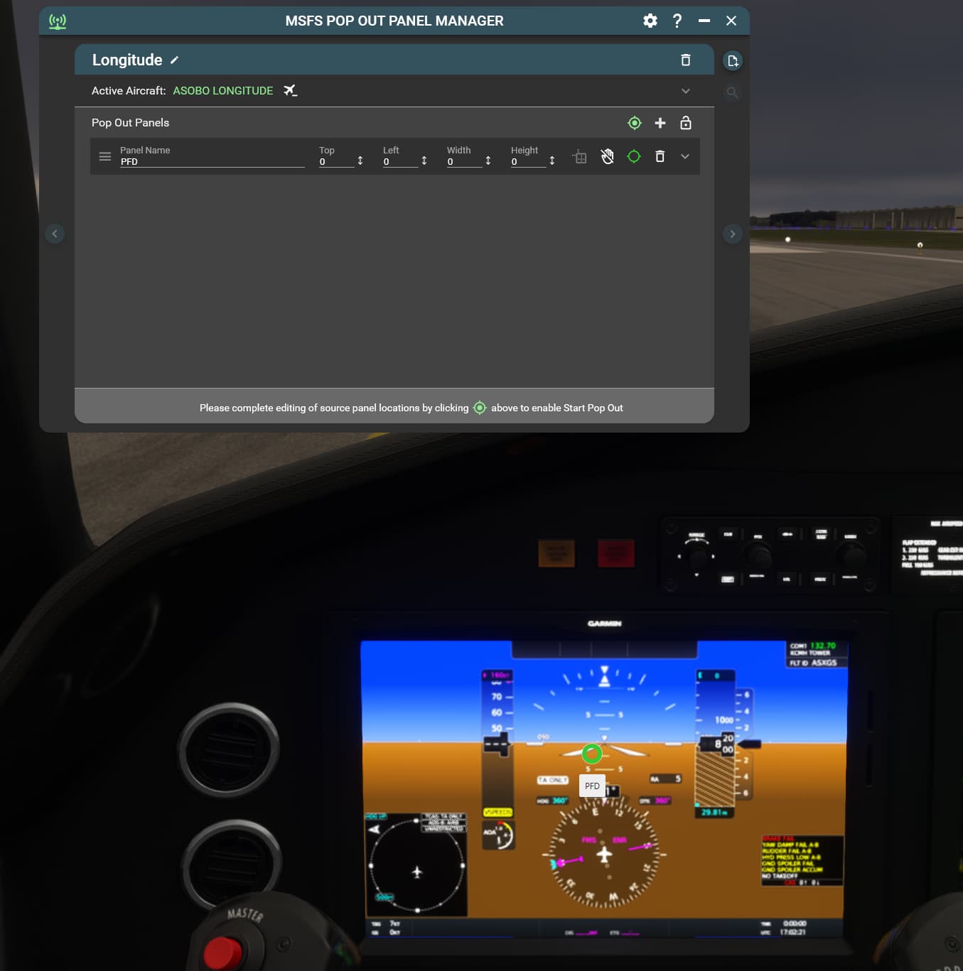 Second - can you post a shot of the virtual cockpit in the correct view with the circle indicating the source point for the panel showing? It should be a green or red circle.