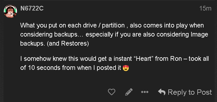 What you put on each drive / partition , also comes into play when considering backups.. especially if you are also considering Image backups. (and Restores)