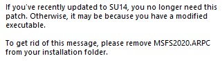 After SU14 was released, I starting receiving the attached error message when launching the sim…this happened right after SU14 was released, when I started the sim in order to download the SU14 update, and has continued ever since (after I downloaded the SU14 update), and still shows up every time I launch the sim.