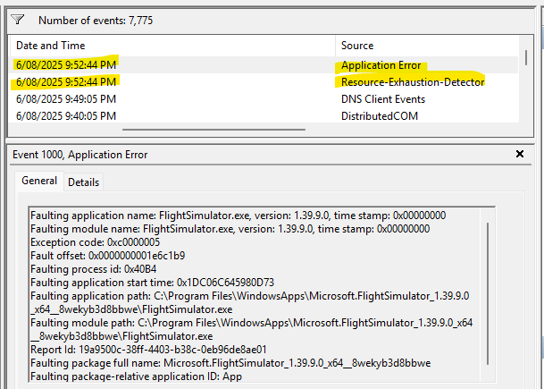The near immediate CTD now happens at NZTL in both normal and safe mode, as soon as you try to pan around either in the cockpit or external views. Event Viewer will show a simultaneous “resource exhaustion detector” event when the CTD happens.