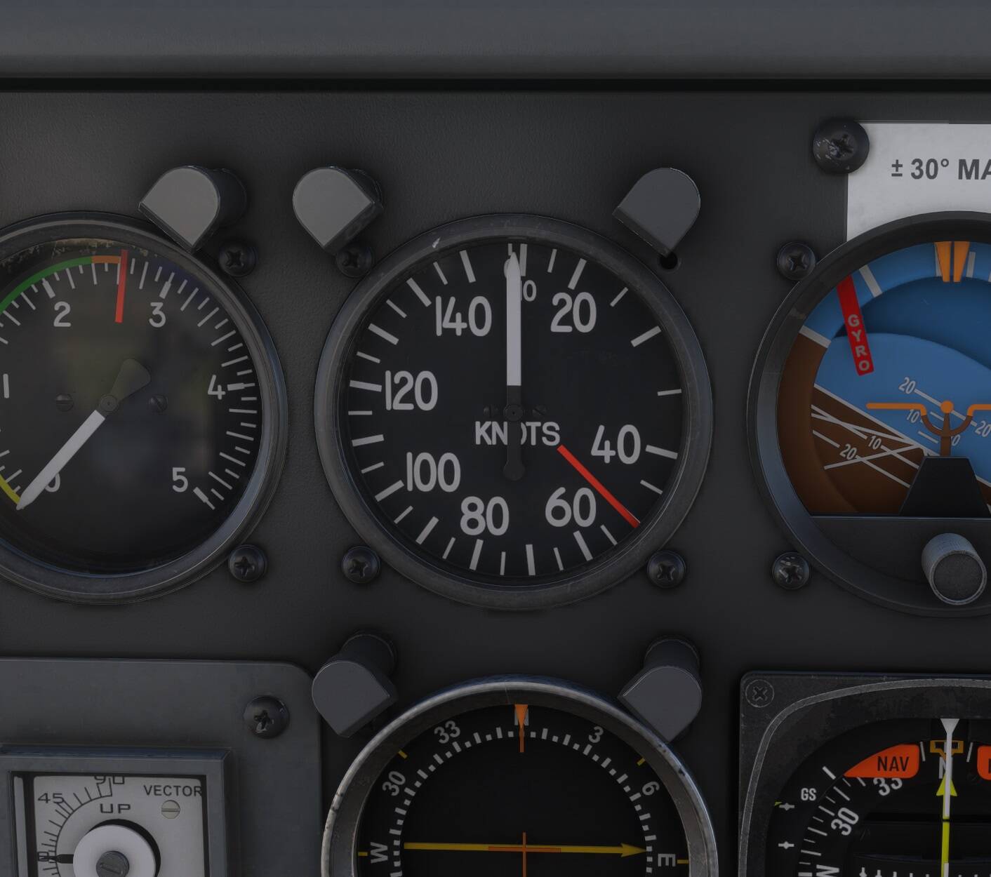 If you haven’t already, bring your throttle to the 2nd detent stage, (arrow above the 30 in 3rd person) the rpms will be over 3000 and you will be traveling at an airspeed of 43 knots, for now we will work with this speed.