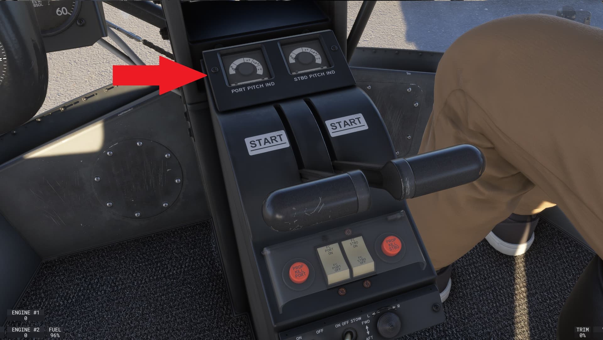 In 1st person view look up towards your Dampers and then look over to right right, above your co-pilot. You’re going to see a small meter. It’s a white rectangle with black numbers and a little ball. This is going to show you how level your blimp is during flight and whether you are pointing slightly upward or downward, make sure you check on it if you are unsure of your blimp being level in the sky.