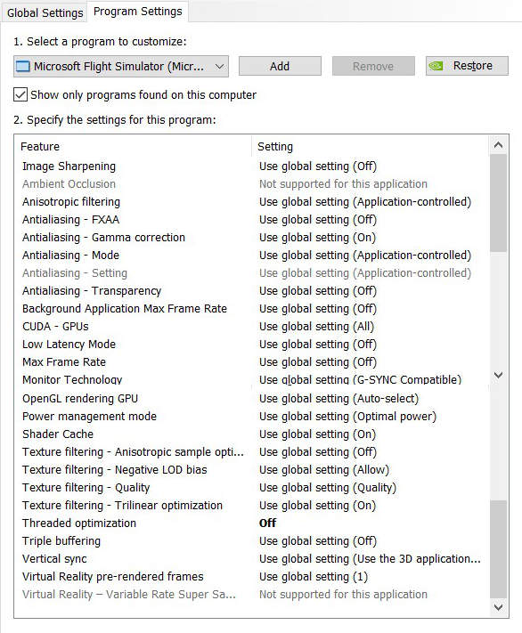 NB: most settings are using default values in my screenshot. They are inheriting from the Global Settings. If your global settings are different, they will also reflect in your FS2020 custom settings. Besides “Monitor Technology” all the others should match whether inherited or overridden.
