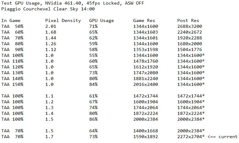 Otherwise Iâve settled for TAA 100 + SS 124 for weeks now. This gives the benefit of ideal EFIS legibility and external visuals with the right amount of render view pixels the 2070S can deal with for motion smoothing. This combination also has interesting aliasing properties (NB: the inverse of anti-aliasing) which is helping the visuals in trading some of the smoothness for clarity. This is making the rendering displaying on the Index panel resolution in a way which is beneficial for the view to me. Higher SS with the same TAA will not improve the visuals much and give lower perf/pixel results.