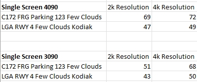 I haven’t tested VR in your test locations as yet, but in the C172 and Kodiak I’m getting way better FPS with only a Radeon 6800XT, which surprised me, as I’m on 1440p which is higher than 2K (2048×1080 pixels). I started with the Ultra preset, setting few clouds on high setting and OLOD down to 110, as per your settings. Then with the Kodiak at KLGA I increased the settings to everything maxed to the limit, except TLOD which I left at 200.