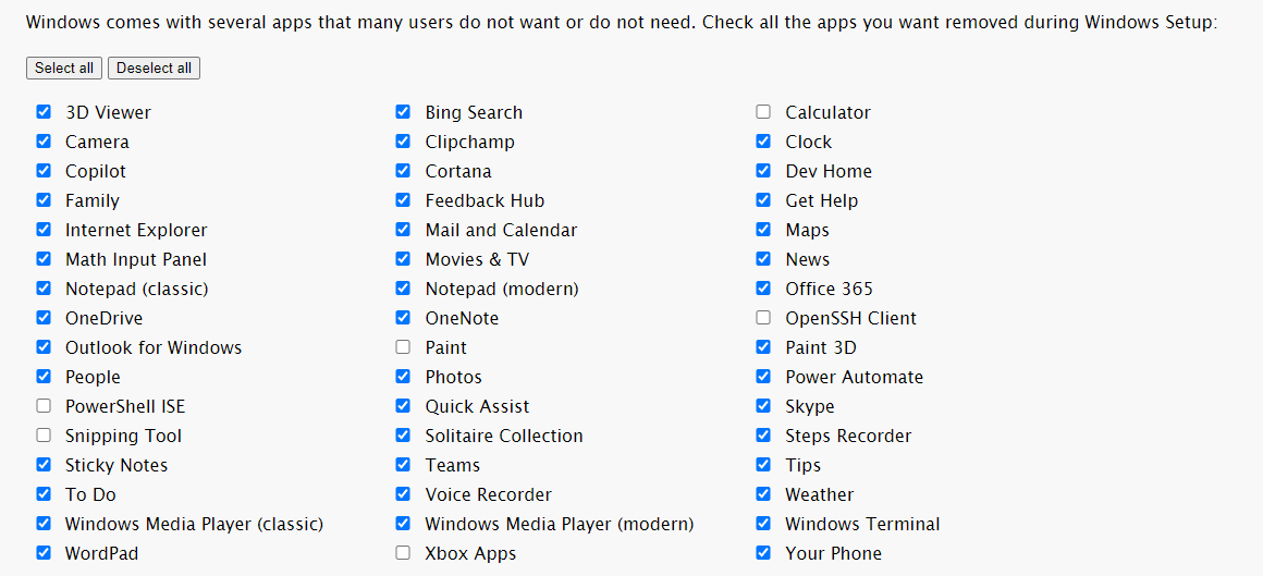 - Look at the screenshot I posted above, showing all the bloatware that you can choose to omit.