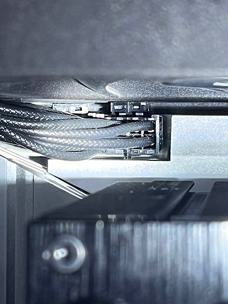 Here’s a pic of the ‘near gotcha.’ The 140mm high static pressure radiator fans at the top of the case are thicker than normal fans. I had a problem with them when I first installed them a few months ago, and had to actually take a dremel to the case - not fun. This time, the 8-pin 12V CPU power cables were the challenge. I had to loosen the radiator and slide it out of the way to get the cables connected, then slide (shove, actually) the radiator back into position. You can see in the pic that there is ZERO clearance between the plugs and the fan housing. In fact the fan is compressing the latches that hold the plugs in place. Fortunately, those plugs aren’t a moving part.