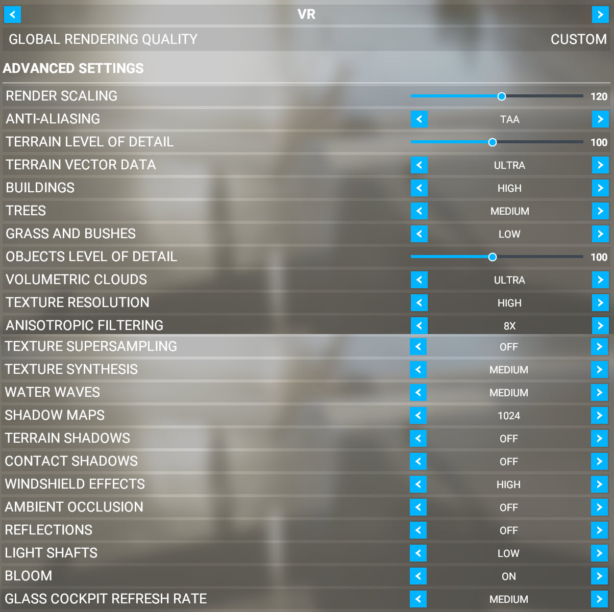 you know i was wondering what would make the gauges and buttons more readable an could not come across any suggestion from the community until now. THanks and ill try the ppdo thing. I only have a 1070 but ocād to about 2Ghz core average on high load. i feel like you should be getting more fps like ~30 but you do have more aggressive graphics options than me. Im on everything medium with %100 resolution scale x16 AF (does this have a performance hit on VR? usually AF has no performance loss up to 16x on every regular DX11 game). getting like 27 - 30 fps flying 2,000 ft
