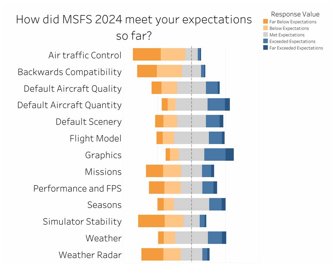 If you download the full report, you can uncover some more interesting data about how well people feel MSFS 2024 met expectations. For a many of the core aspects surveyed, the dominant response was that MSFS 2024 was below or far below expectations