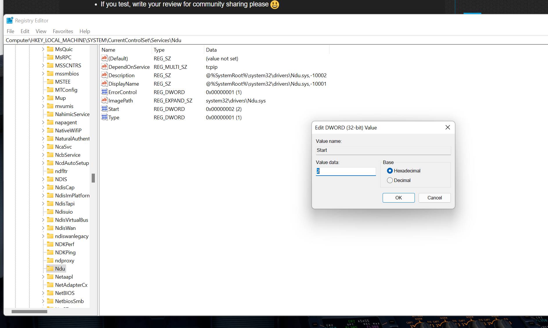 Open the Registry editor app again and navigate to HKEY_LOCAL_MACHINE/SYSTEM/ControlSet001/Services/Ndu.