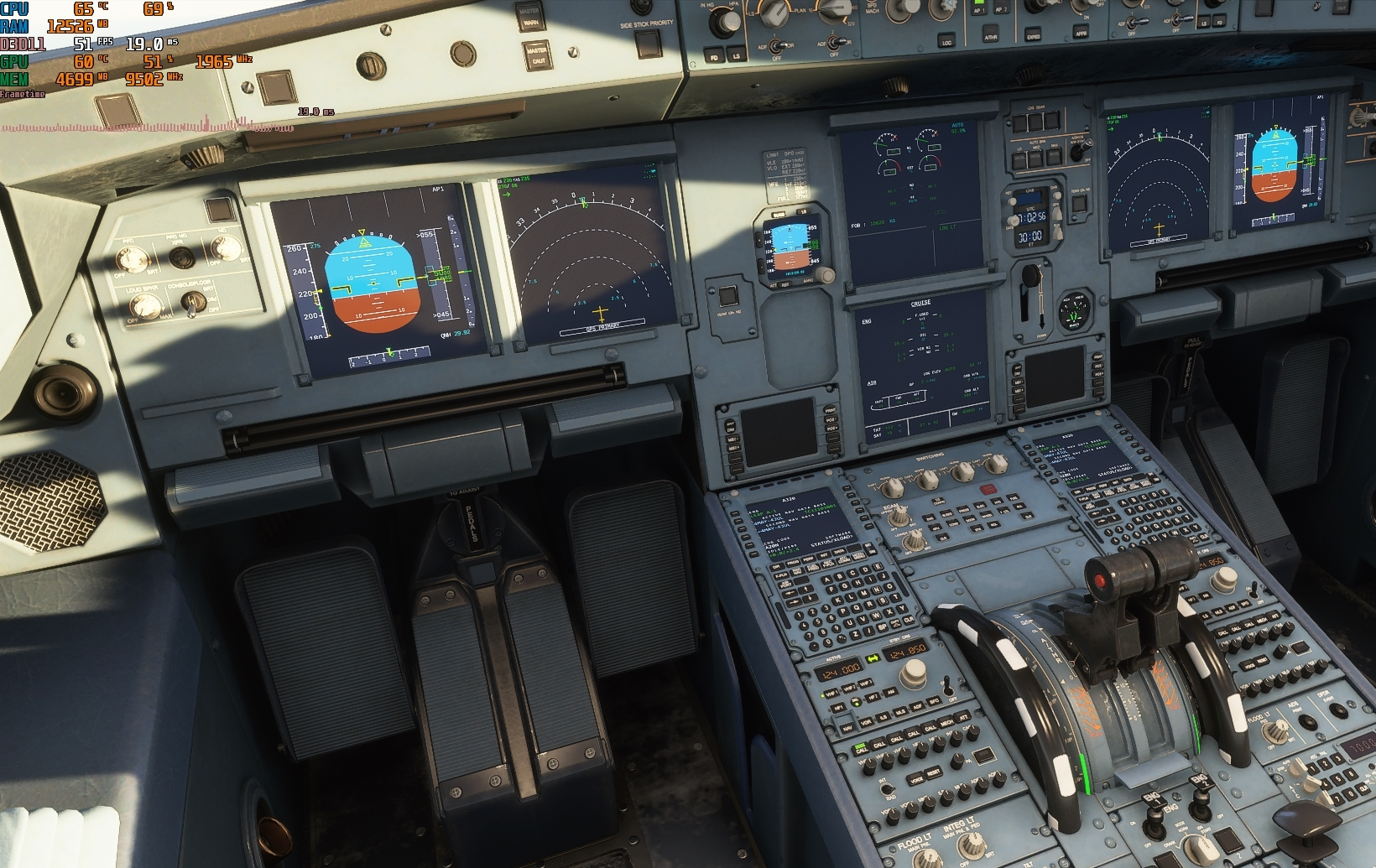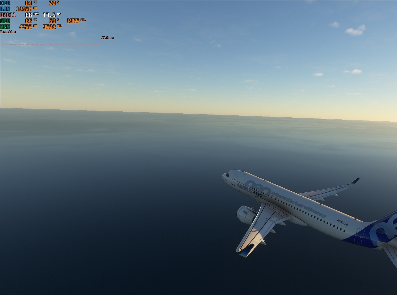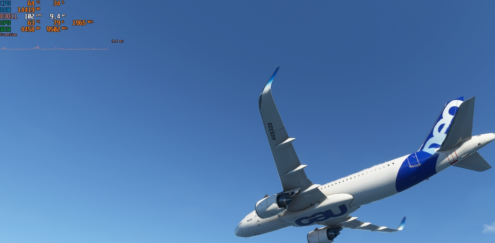 Heres a good example: Middle of the ocean, looking at the sky outside view. Really easy job for the system to render frames, as there isnt really anything complex to calculate other than the plane exterior. 102fps, CPU at 34% (no threads at 100%, all 12 threads at around 50-60), GPU at 79%, 1965Mhz. Still GPU is not at 99%. If nothing is bottlenecking, why doesnt the card go to full capacity? (i have had moments where it goes to 99% at FL400 when looking at the sky, so it cannot be because of the resolution)