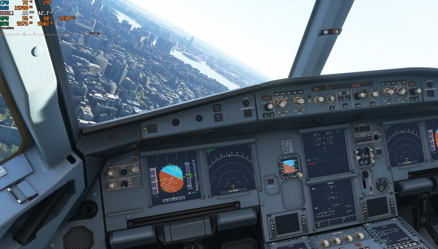 The point was comparing the performance hit that the cockpit makes and how the cpu and gpu seems to be affected. It has nothing to do with whats going on near the plane. But to do it your way, heres some pics to show that exactly the same issue happens in the middle of new york: