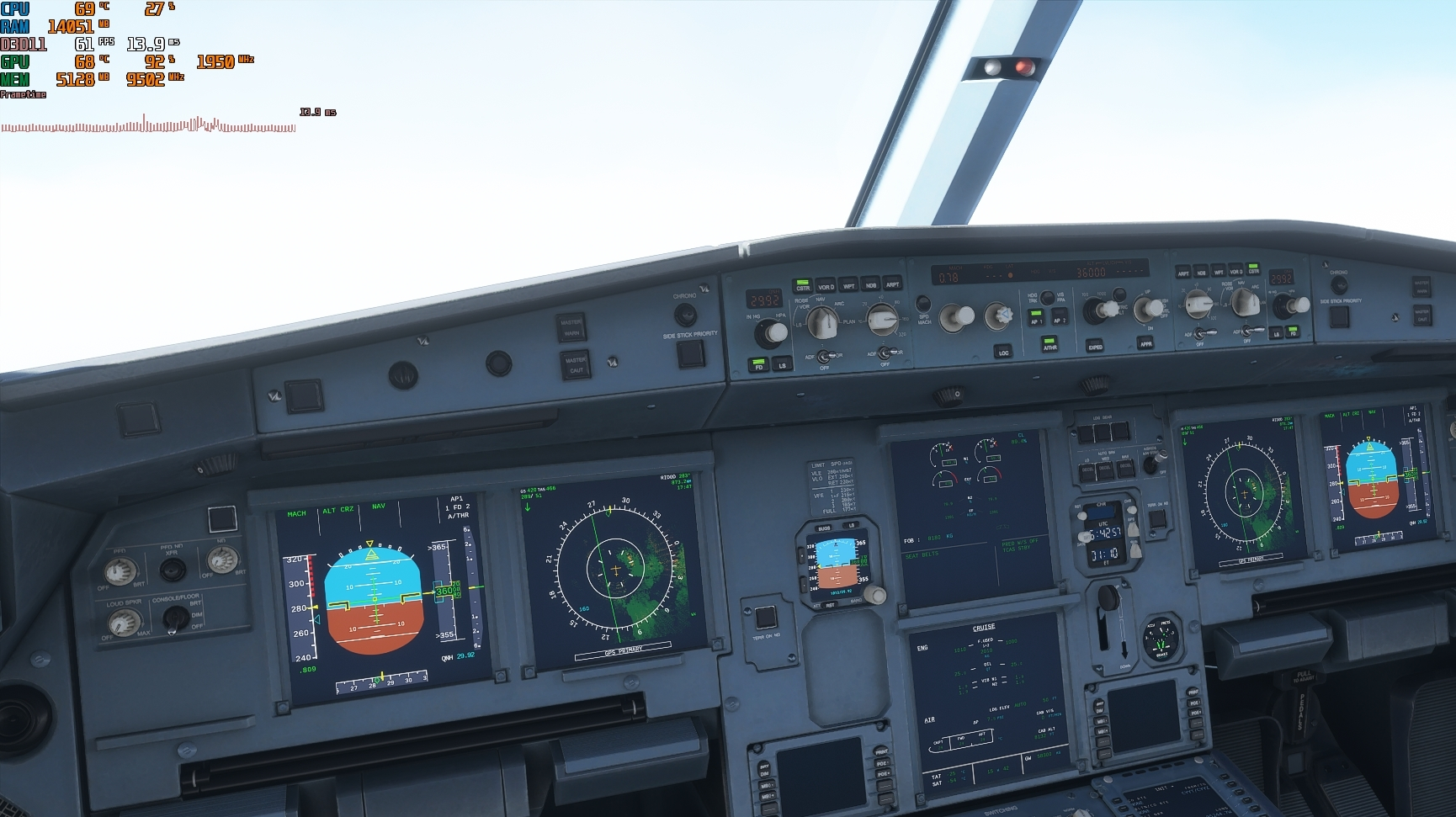 Glass cockpit refresh rate at low seems to work very well! those are the gpu usage readings im used to. I noticed that frametime shows to be really spiky in cockpit, i’d bet my right hand that each of those spikes represent the refresh frequency of the glass cockpit… Outside view is a straight line without any spikes.