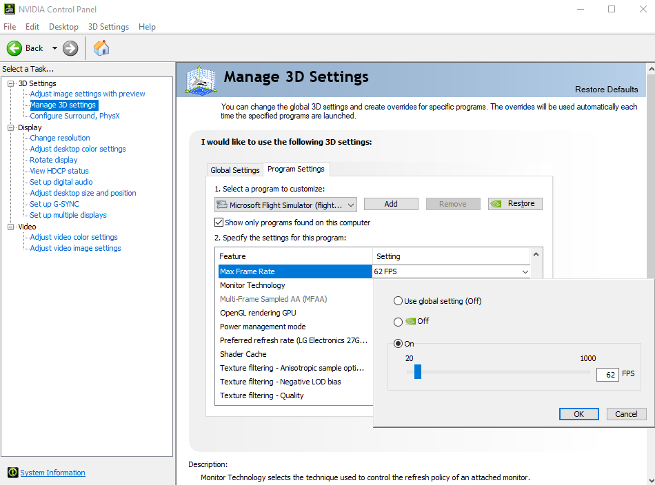 Yesterday when I ran MSFS 2020 in developer settings I could see I it was CPU thread limited but today someone in this thread suggested going into Nvidia Control Panel program settings for MSFS 2020 and changing the following two settings which I did after updating the driver.
