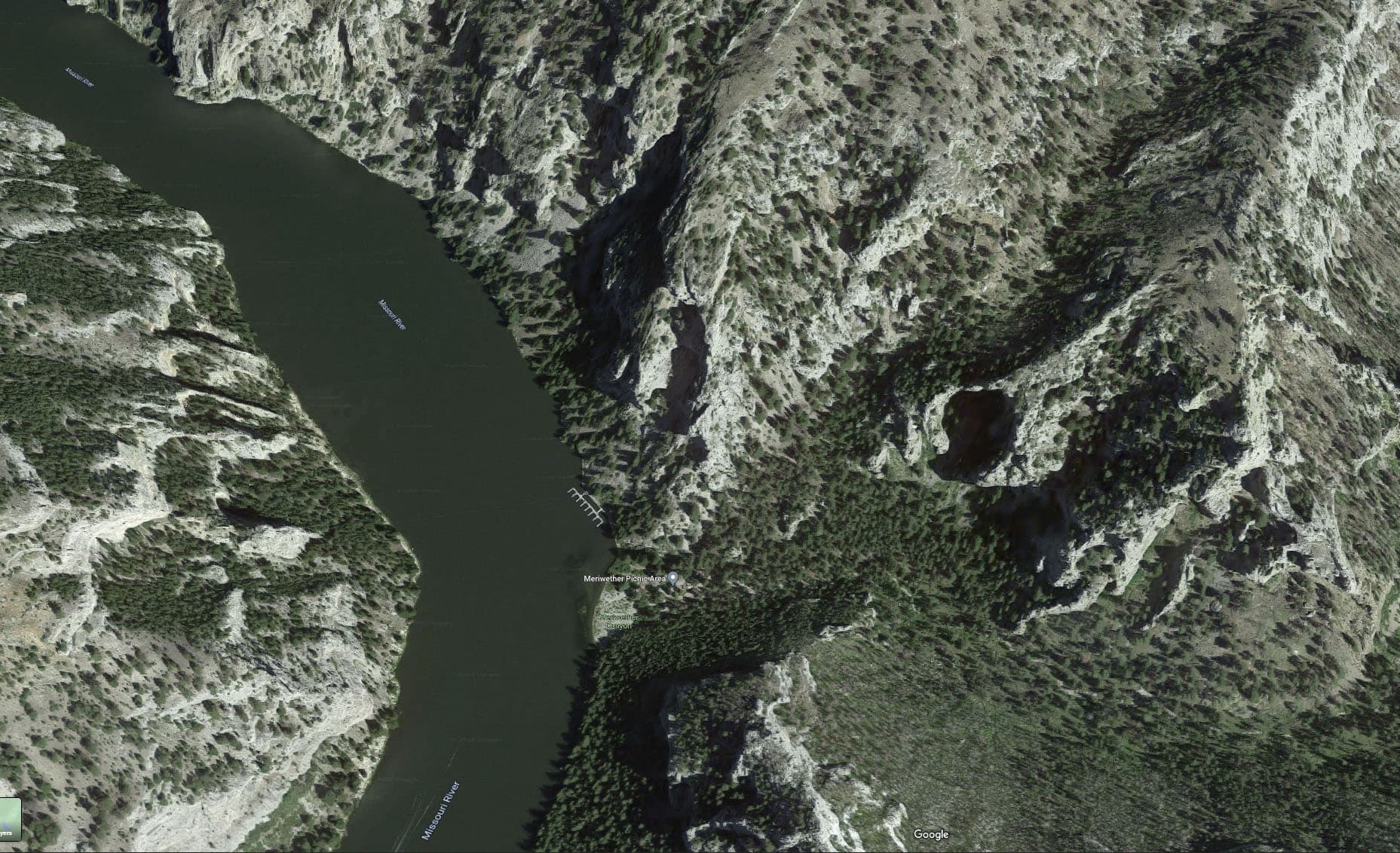 To illustrate, hereās what the mountainous terrain down the river a bit from Mann Gulch, MT looks like in real life (3D Google maps satellite view). The mountainsides at this particular spot have humungous cavernous holes in their sides.