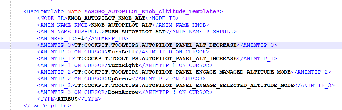 If you notice, for each position of the knob there is a tooltip, up arrow, down arrow, turn left and turn right. In the new Asobo templates, animtip or tooltipid no longer exists, however this template has not been fixed. and thatâs why you donât see those descriptions in the a320 or any other airliner that needed to use this template, that would explain why in some aircraft you see a dot or the white outline as you mentioned.