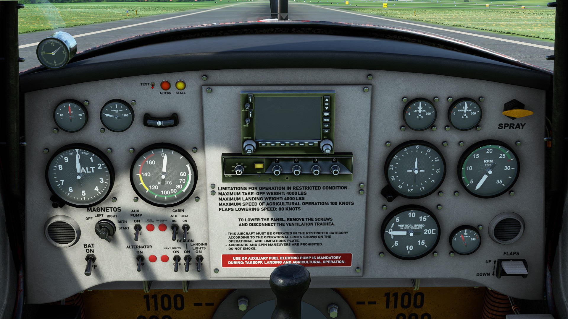Everything is done really well, it looks like MSFS and the standard is pretty high. It’s a weird-looking little plane, but I can’t complain about anything here. The buttons for Static Elements and Refill Chemical Tank are on the panel but look like lights and are easy to miss. Unfortunately, the documentation is very poor. (Also, the max altitude in the sim doesn’t match what’s actually in the documentation)… Can’t open doors or windows. Static elements can be seen in the screenshot. You can see them chemical trails in the screenshot. The level gauge seems to work as well! Comes with 4 liveries.