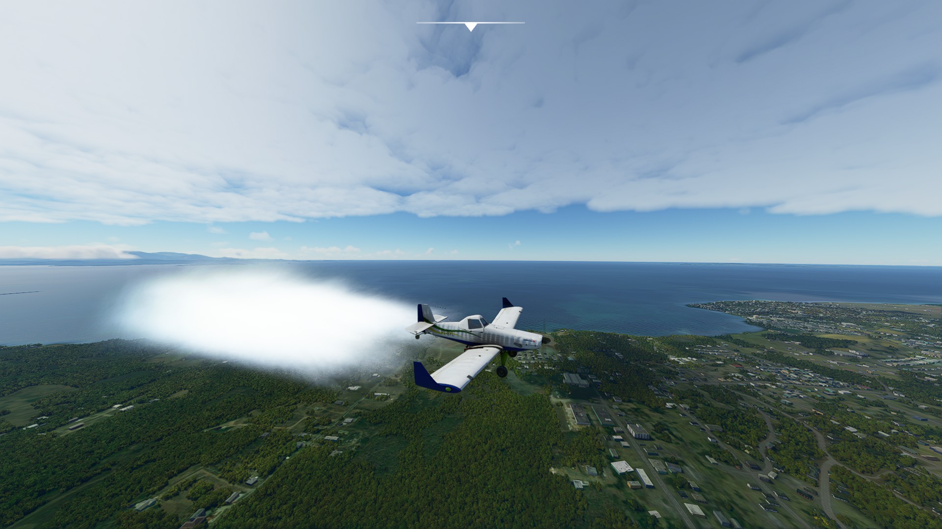 Without particle effects, a crop duster is nothing more than another Extra with more pipes hanging off of it. Back in the FS9 days, I got one of the leading XML gurus to write an invisible gauge that turned on the smoke when the aircraft was in the air and the brakes were engaged. Since the brakes were set to the trigger of most sticks by default, it was easy to control either airshow smoke on an aerobatic plane or the crop spray from one of these. I may even still have the code stored away somewhere…