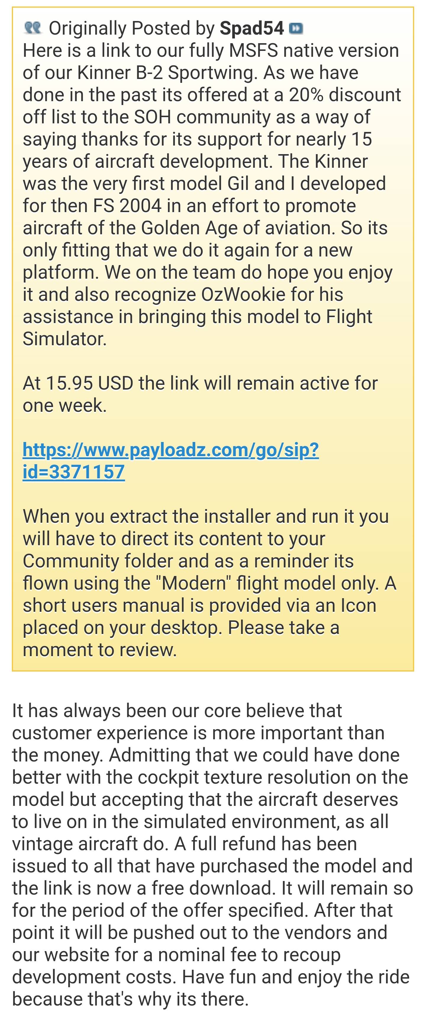 Not sure how many of you here keep an eye out on simouthouse, having been flying, enjoying and following these guys since this Kinner 1st arived way back in FS2004. So was exited to see this coming to MSFS. I got it earlier when released and was surprised to have recieved a refund.