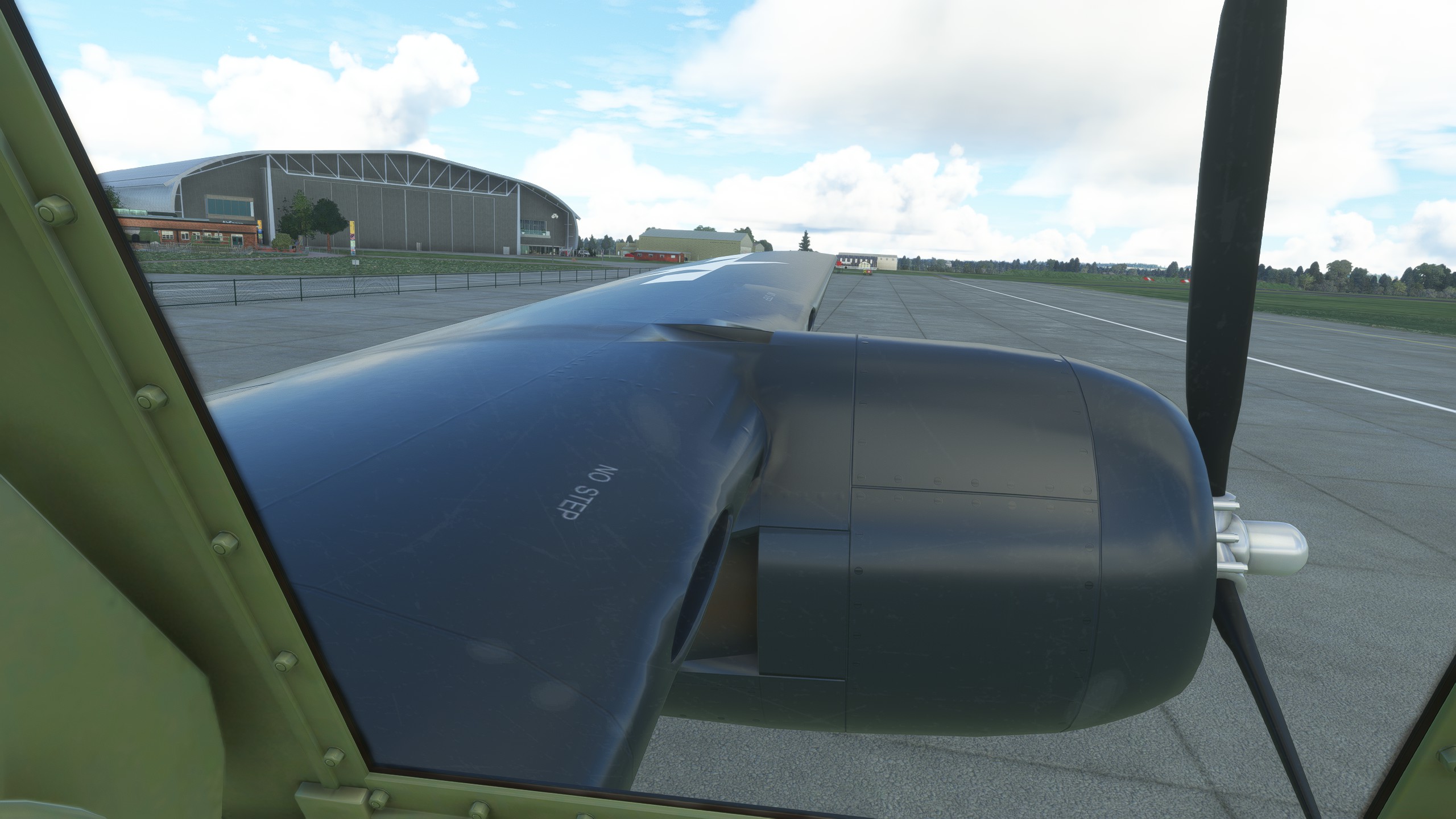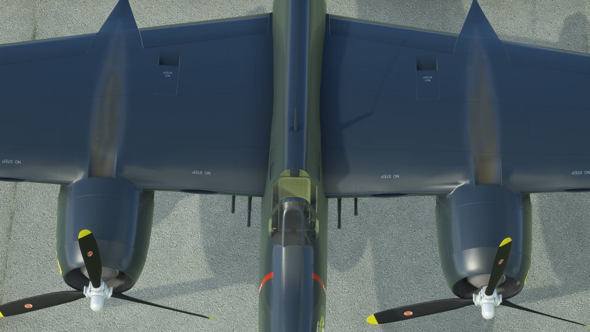 All textures are very simplified with only 3 “No step” labels on each wing and the propeller warning on the fuselage. There are barely any rivets & fasteners, many inspection panels are missing and the fuel caps are only visible as circles. The overall shape is good, but the freeware FS2004/FSX model by Milton Shupe was more detailed.