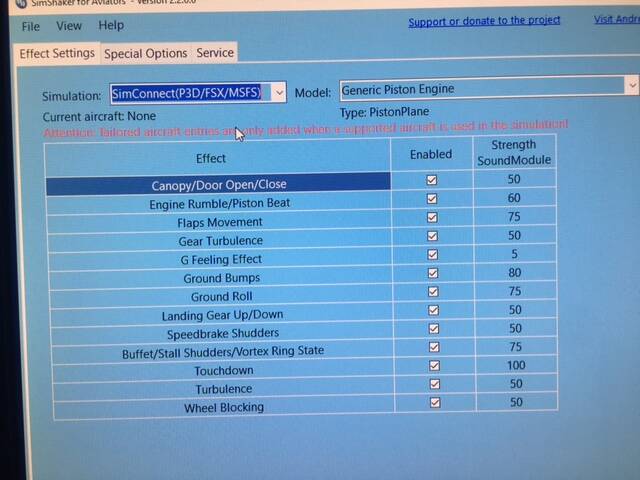 Also, make sure to play around with the Strength SoundModule settings in Simshaker for avaitors. The default of 50 is not good. It took me a few days to even realize I could change them (duh!) by clicking on the value. Attached are my settings for the Cessna 172.