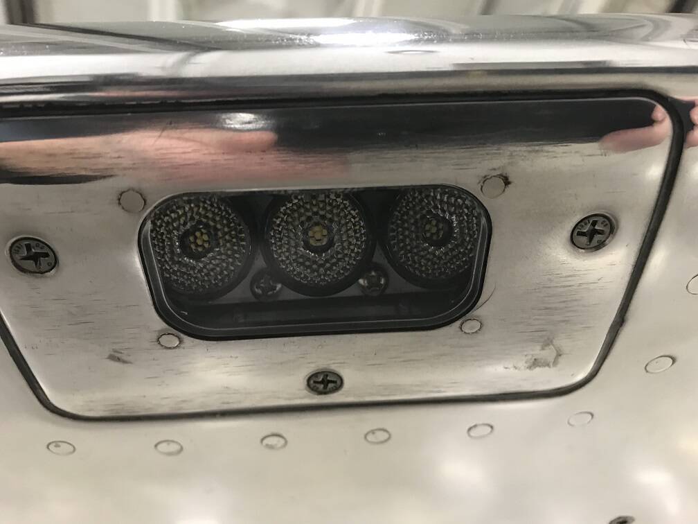 The tail flood (logo) lights are located at the aft part of the engine mounts, not the forward part, and the lights illuminate the vertical stabilizer much more, and are centered on the reg numbers. Here is the IRL location of the lights (this is the right engine mount, so engine cowling is on the right, and fuselage on the left):