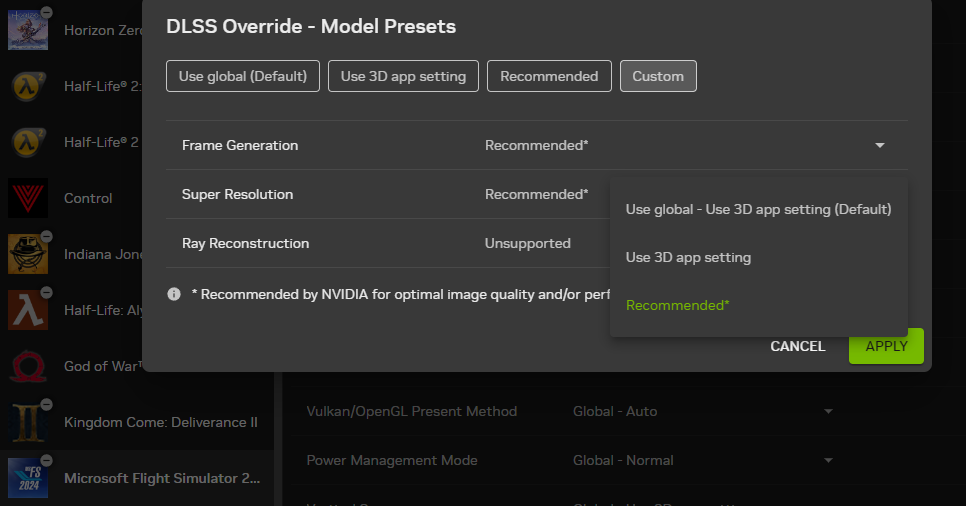To be 100% sure: I still have to set the “Recommended” option in the Nvidia App, and then set DLSS Performace in Game?