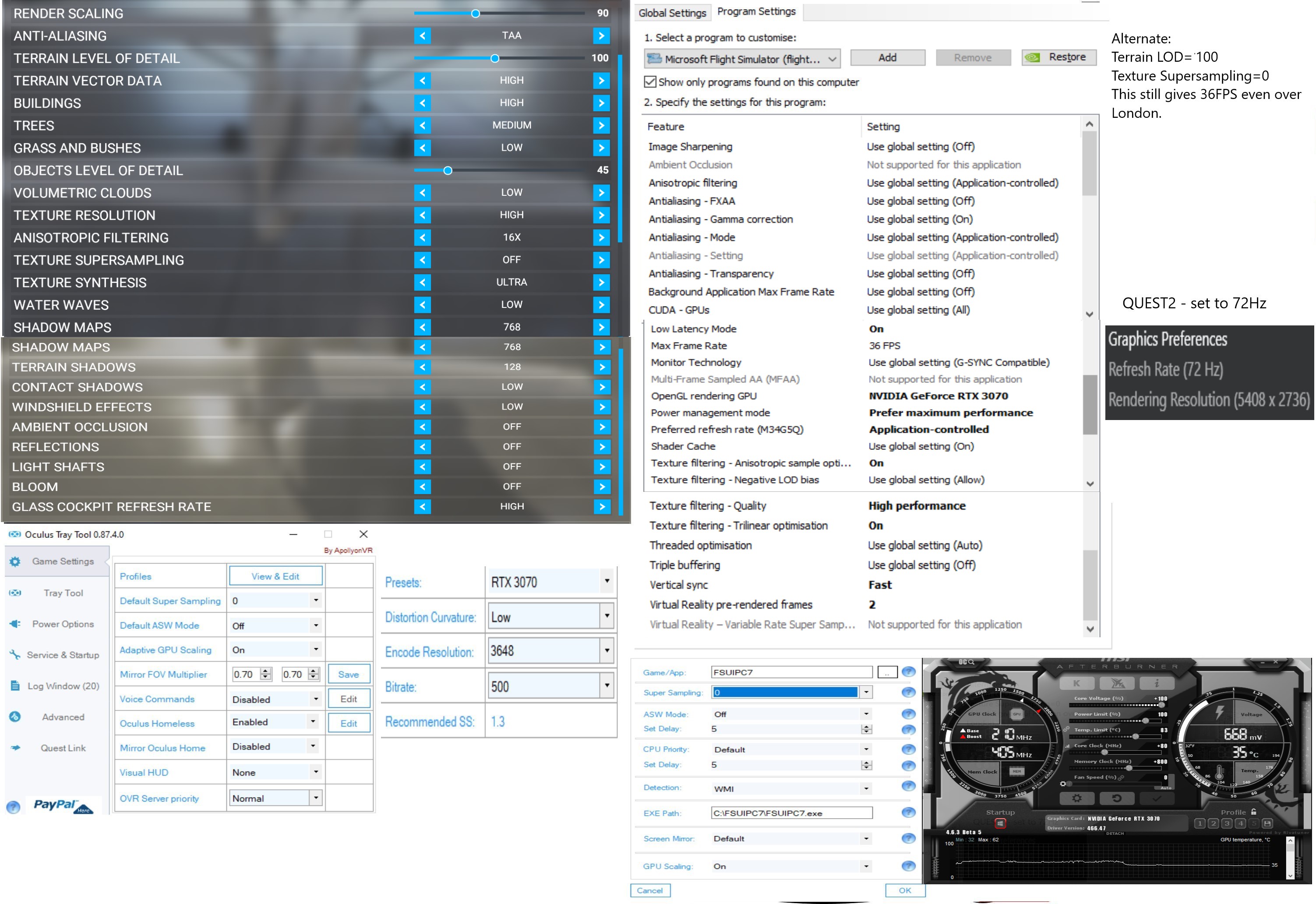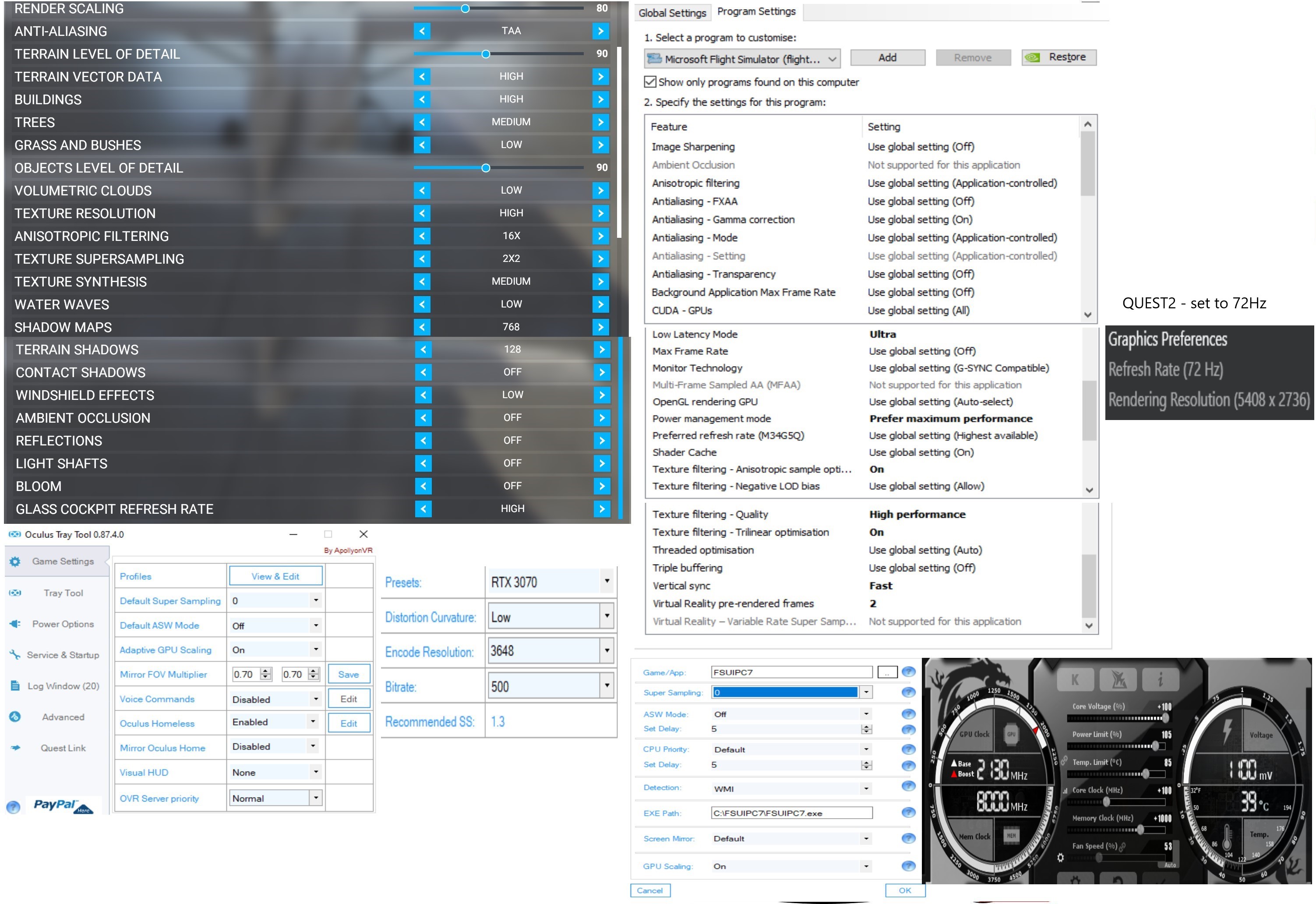 My entry into MSFS VR was woeful, initially only getting 11-20 FPS. After a week of trial and error, here are the settings that now work for me. My 5600x is overclocked to 4850Mhz and the 3070 as shown in the image. The OTT executable shows FSUIPC as I have this set to load when MSFS loads. Also, I have ProvideAIdata=No included in my FSUIPC ini file - I find this really reduces the number of MSFS crashes. I recently upgraded to 64GB RAM and find that this really reduces stutters and increases overall smoothness in the sim!