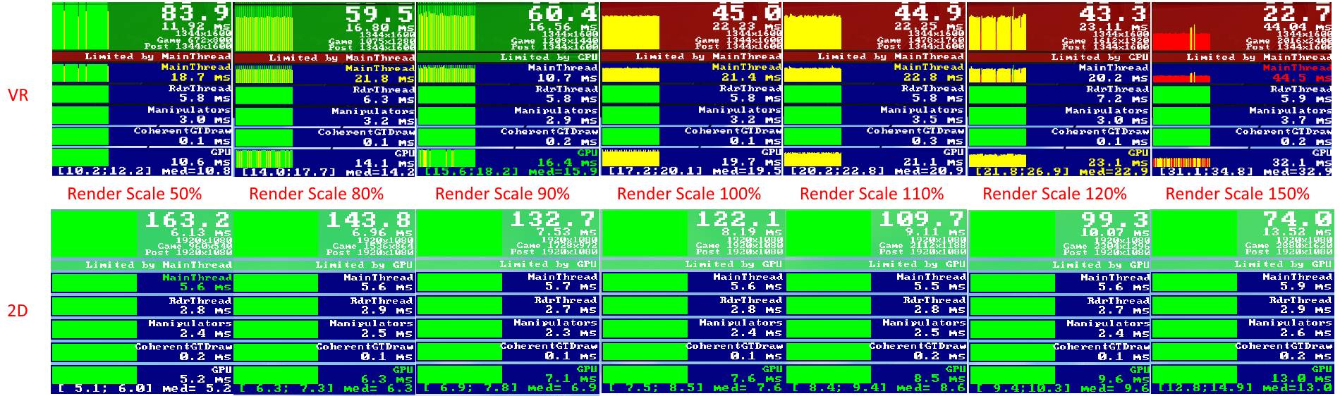 The fun part is I have the Oculus rift CV1, so far lower resolution, and in any case, my game settings are very Low comparing to yours, pretty all at Low or Off (can’t list them from memory), Render Scale at 80, but texture ULTRA (no impact) and SS in OculusDebugTool currently at 1.70, but it move a lot, I make tons of test too, and tired too. No satisfied for now as I struggle to keep 45fps (ASW ON or OFF, CTRL+2 or CTRL+3). Some can handle 30fps or even 18fps but I simply can’t, make me sick, and it’s far from smooth even if I manage to have CPU and GPU headroom (I can reach 60fps lowering SS). Not happy, frustrated too… As I said, my in game settings are very, very low to achieve those 45fps, not stable (wavy)…