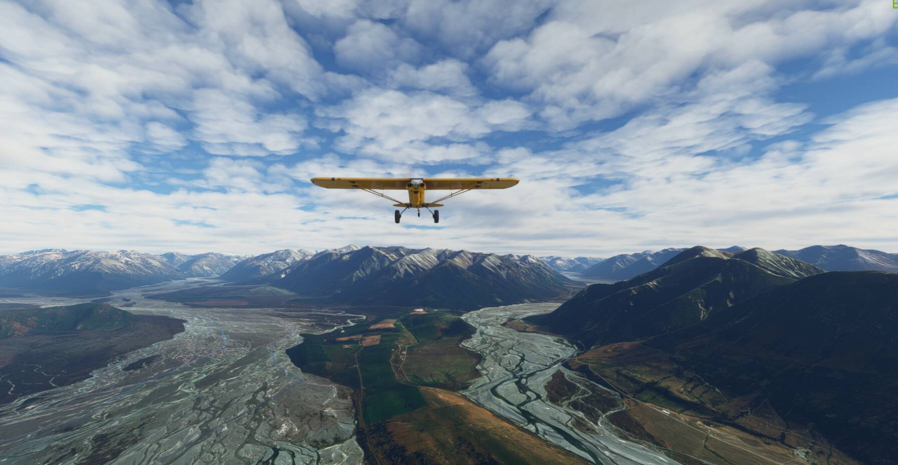 This is the Harper River and it flows south west past Mount Ida on your left to merge with the larger Wilberforce River at Waypoint 21. As it does, turn left around Mount Oakden and follow it south east. A narrow peninsular juts out as the Wilberforce in turn merges with the even bigger Raikaia River- at which point, I recommend switching to outside camera view and checking out the view behind the aircraft. It’s a spectacular landscape when viewed in wide angle.