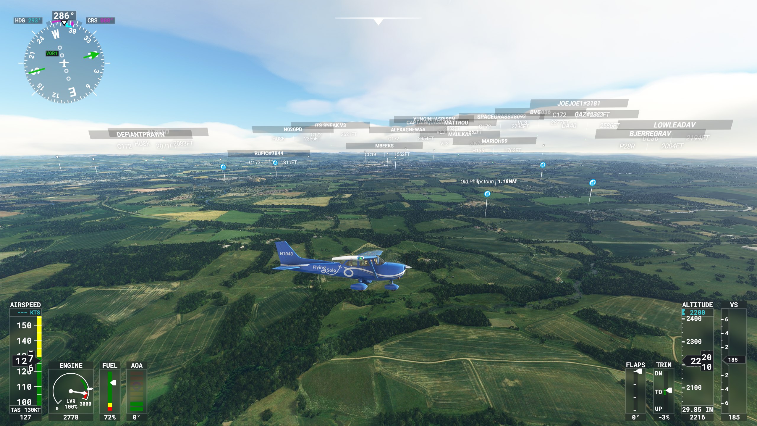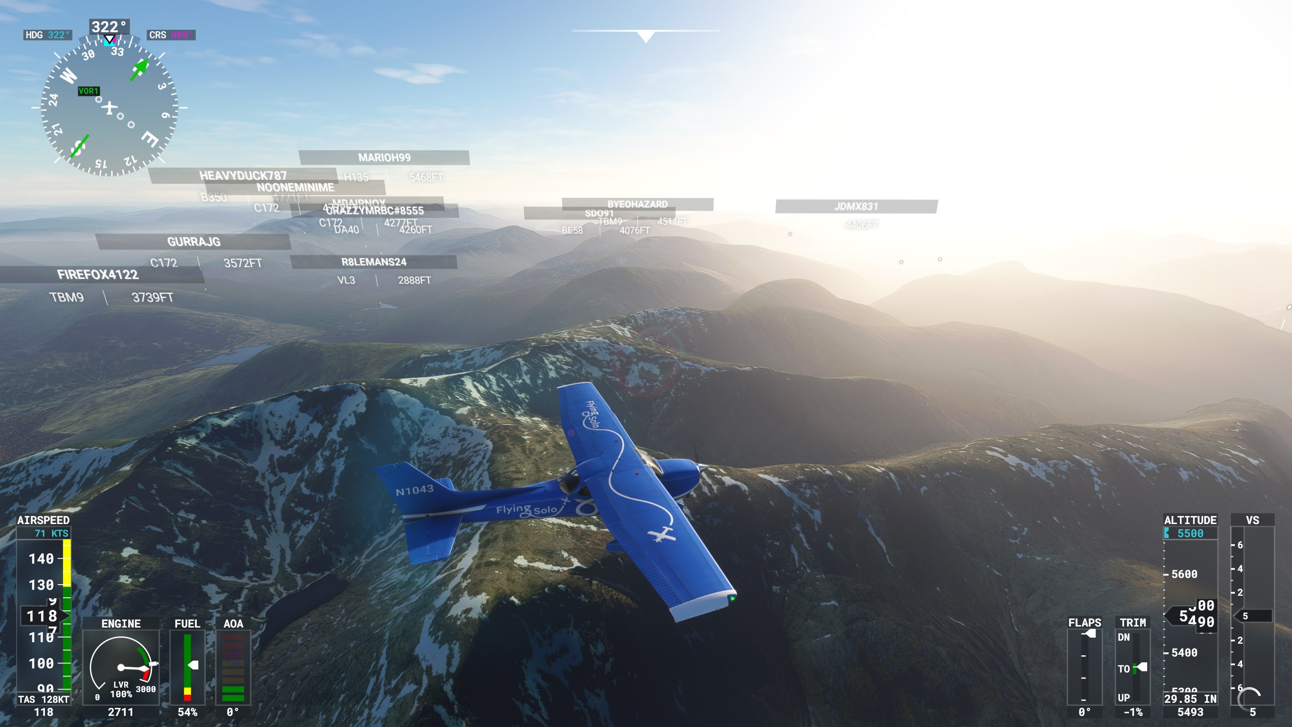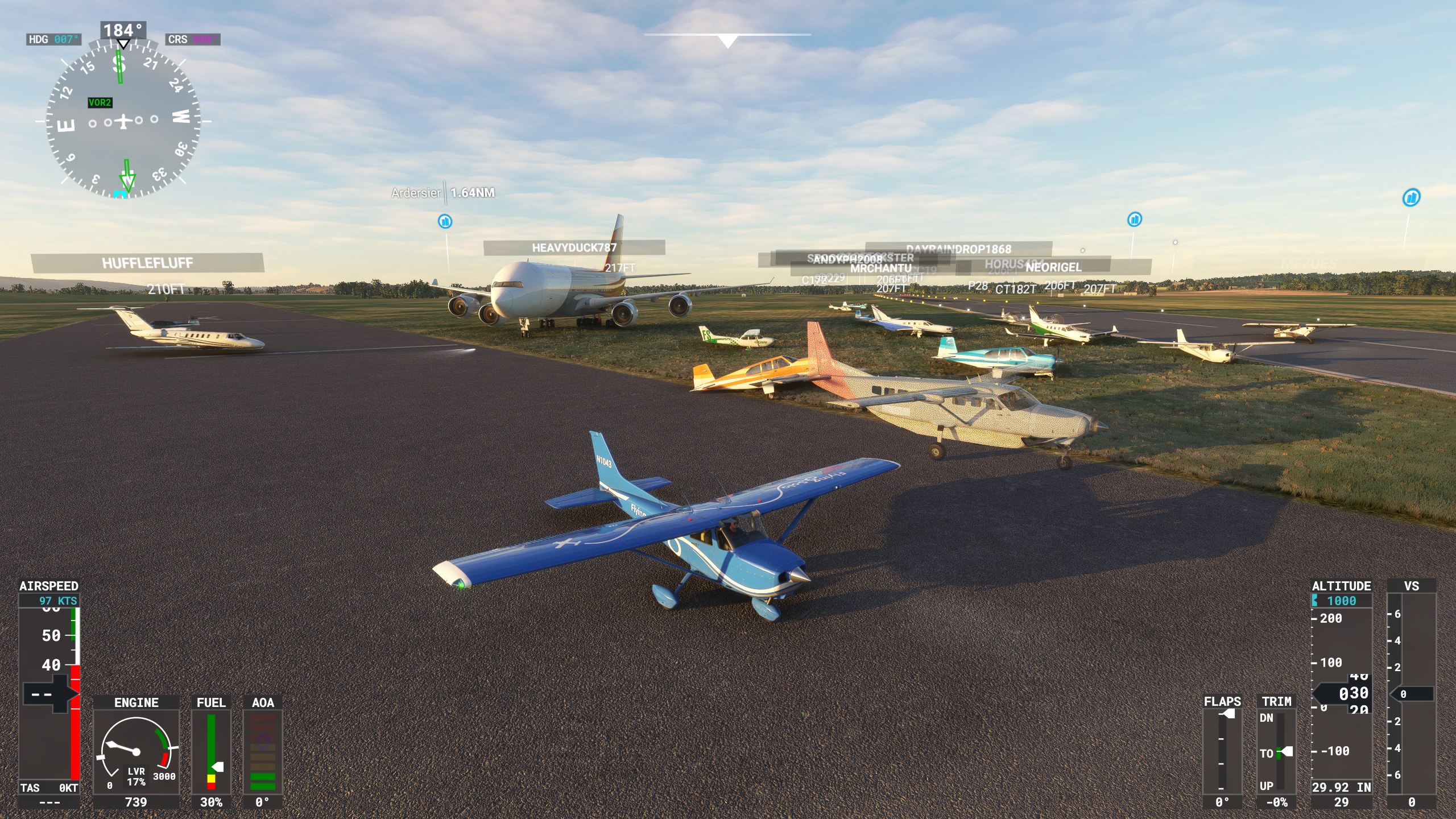 It is advised in this flight to turn off both aircraft collisions and terrain collisions. If you do crash, you can use “slew” mode to join the pack. If the pack will be too scattered before the first stop, we will use slew on a defined point to regroup.