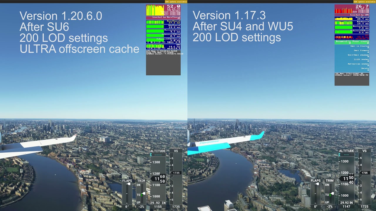 I was part of the SU5 beta, and immediately before that started, I recorded a video of a âstandardâ flight. This was version 1.17.3, so was after SU4 and WU5. To make it repeatable, I use the AI copilot to fly it, so untouched by human hands you might say. It is a flight from London City (EGLC) to Heathrow (EGLL) straight over the top of photogrammetry London. I do it at noon and with clear skies to avoid as much variability as possible.