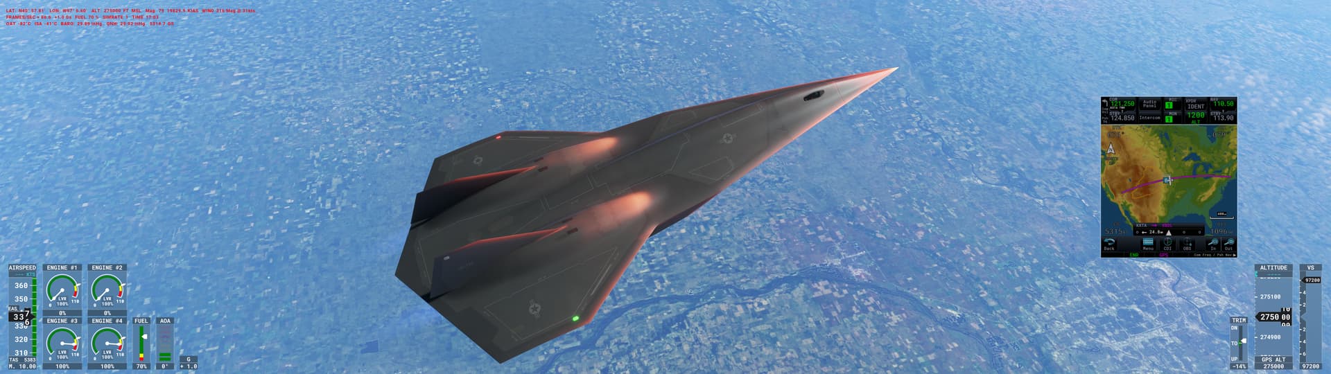 Just flew from the awesome Area 51/Groom Lake to Bradley Intl. in Connecticut in 37 minutes, 10 seconds, most of it at 275,000 feet and Mach 10. So much fun! Hope they fix the “upper hard deck” at 275K feet in a future revision, but even with that, it’s pretty awesome.