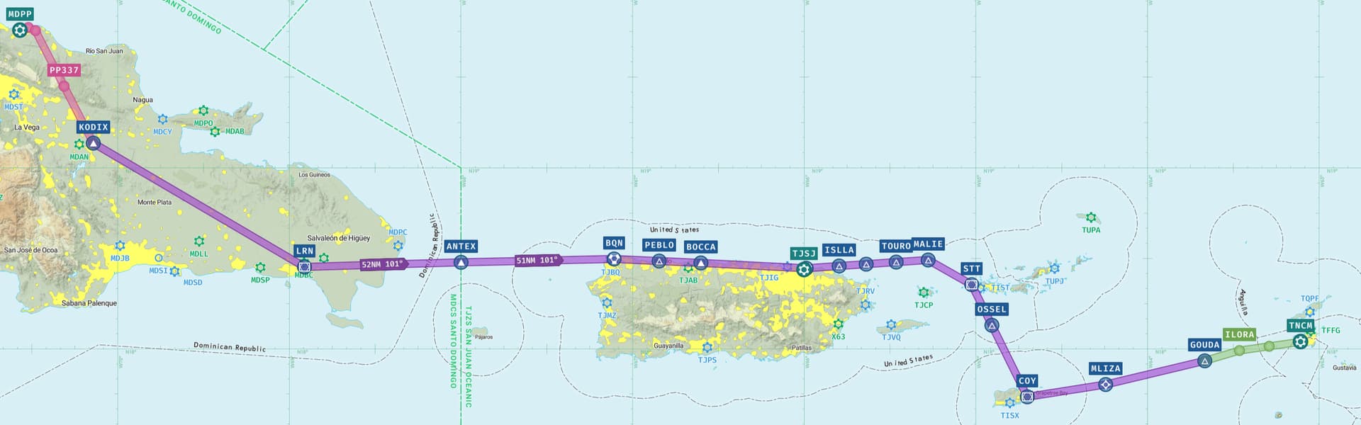 If you’d like to join in and replicate the flight, the route is as follows: MDPP KODIX UW24 LRN DCT ANTEX DCT BQN RTE2 COY L204 GOUDA TNCM