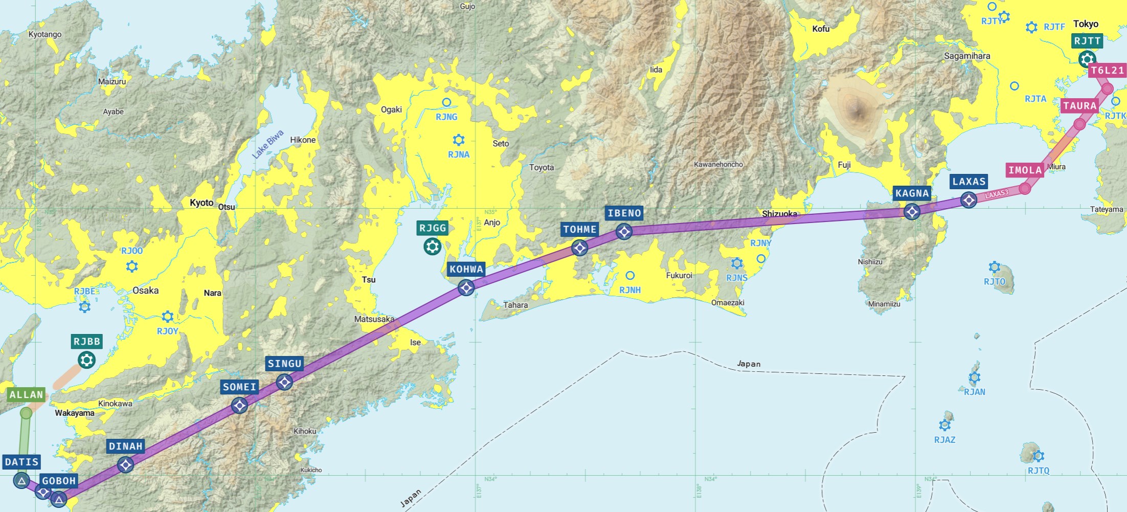 If you want to join in and replicate the flight, the route is as follows: RJTT LAXAS Y56 TOHME Y54 KOHWA Y544 SINGU Y542 DATIS RJBB