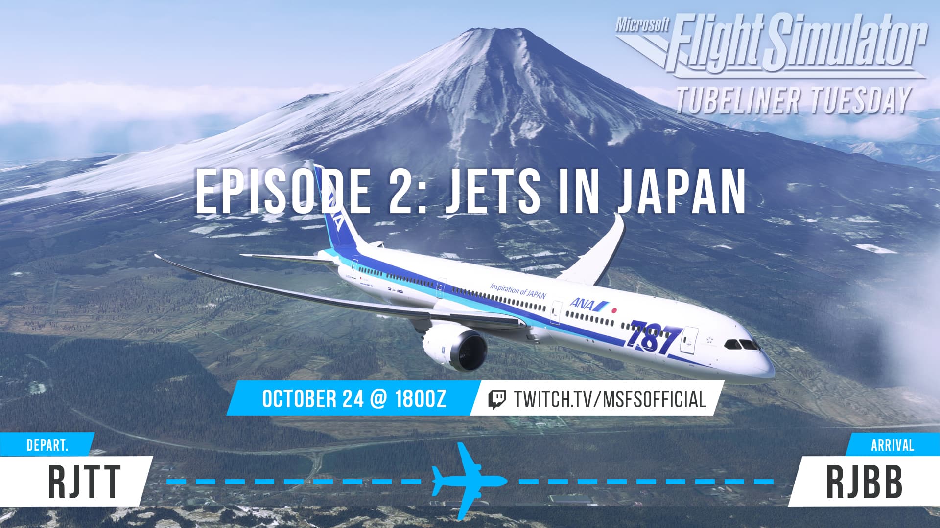 A domestic flight across Japan is the setting for the second episode in this series. Departing Tokyo Haneda (RJTT), we will venture west to Osaka Kansai (RJBB) with Al Nippon in the default Boeing 787, available to all Premium Deluxe owners of Microsoft Flight Simulator. This aircraft has had recent updates in Sim Update 13 including an Electronic Flight Bag to calculate takeoff performance, which we will cover during the stream.
