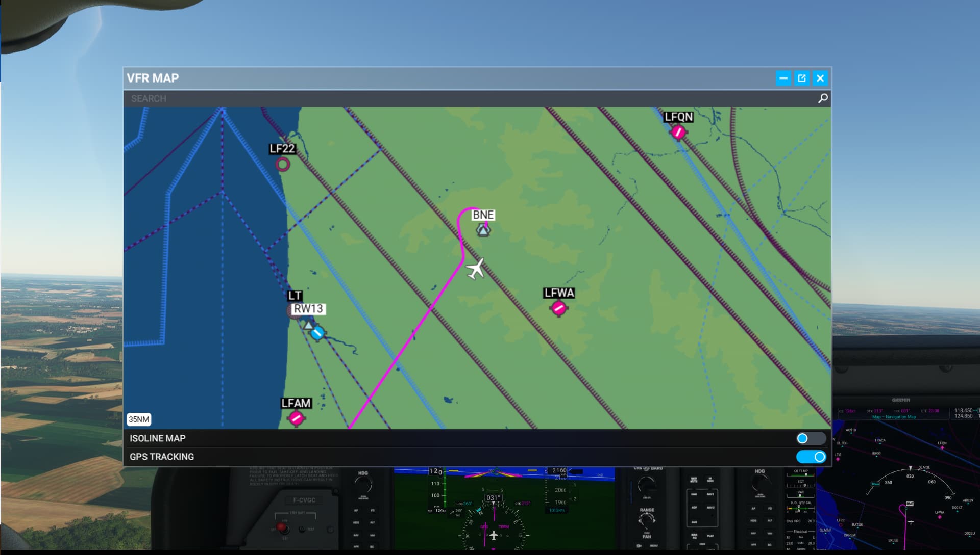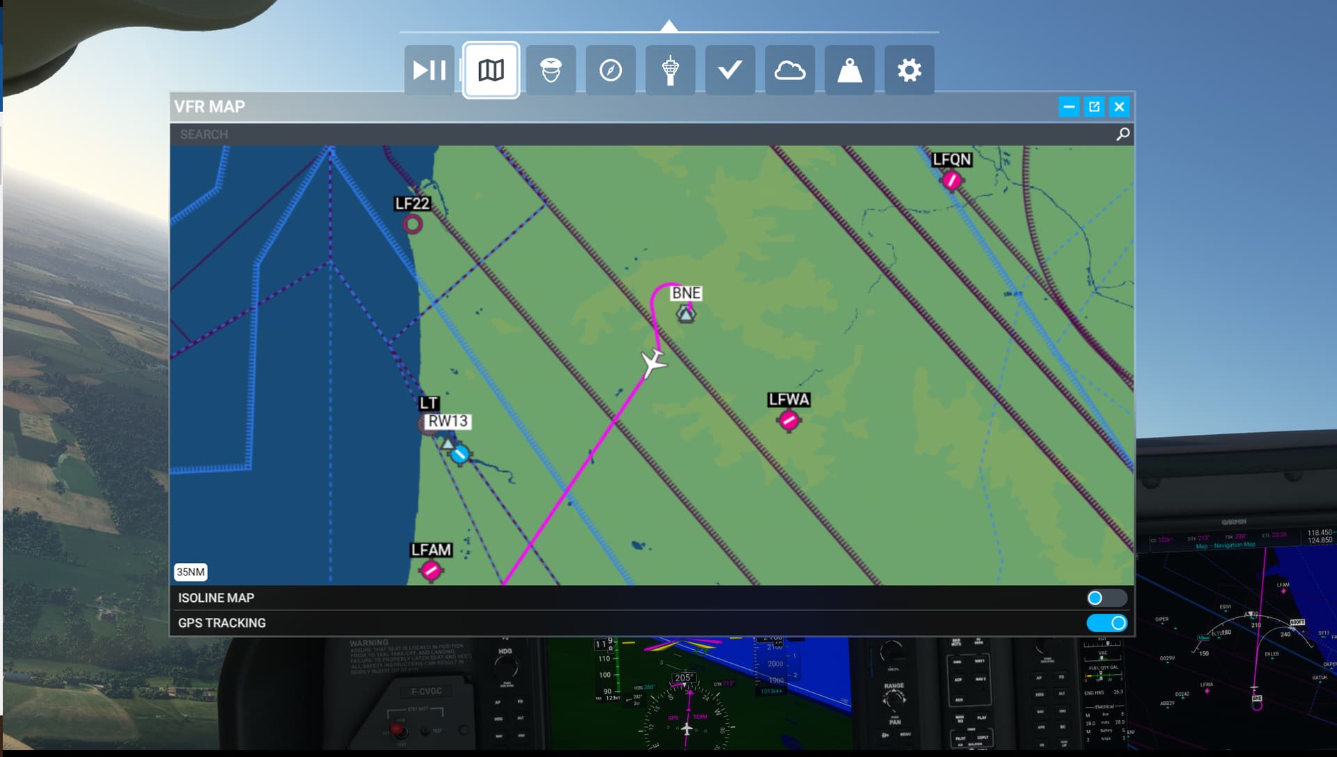 Passing the 1st waypoint BNE, plane is on track to the 2nd waypoint DPE but as you can see in the background, as soon as the VFR Map is opened, the AP starts a 180 left turn