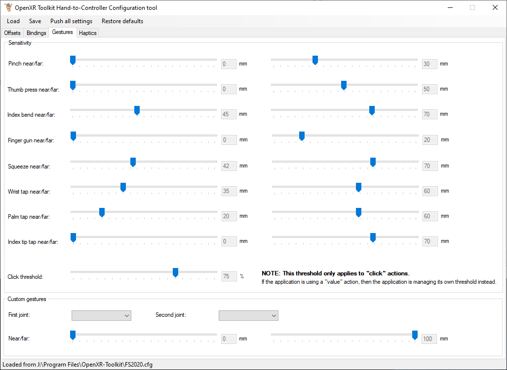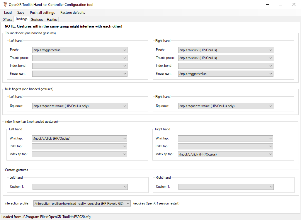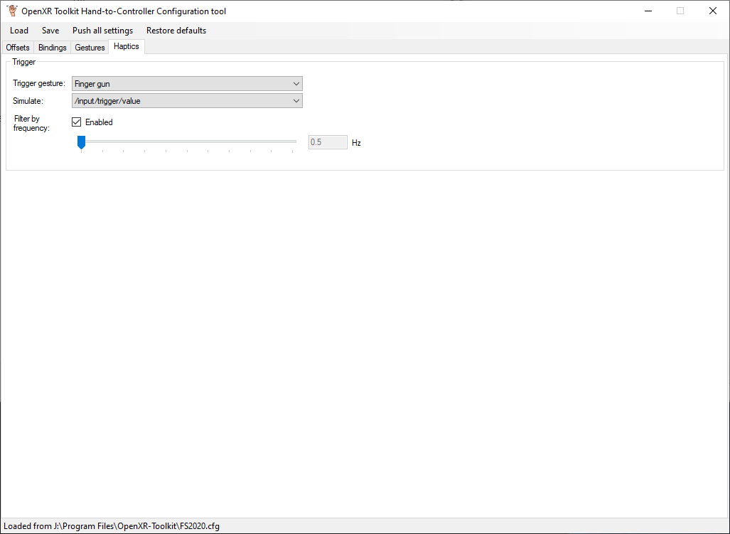 Haptics - this doesn’t work. It was originally my idea to implement this - it’s supposed to trigger the trigger press when you approach any button with your index finger in a “finger gun” position with engaged trigger. On other words, instead of normal “touch until it turns blue, then trigger with thumb on middle finger” it would be “touch thum on middle finger in a finger gun gesture, and in that position just puch buttons - they would trigger automatically as soon as the turn blue”. If you hand is in a “finger gun” gesture already when it reaches interaction spot (haptic click/buzz is sent by MSFS) - OpenXR Toolkit emulates a trigger press. iBut it doesn’t work for me at all.